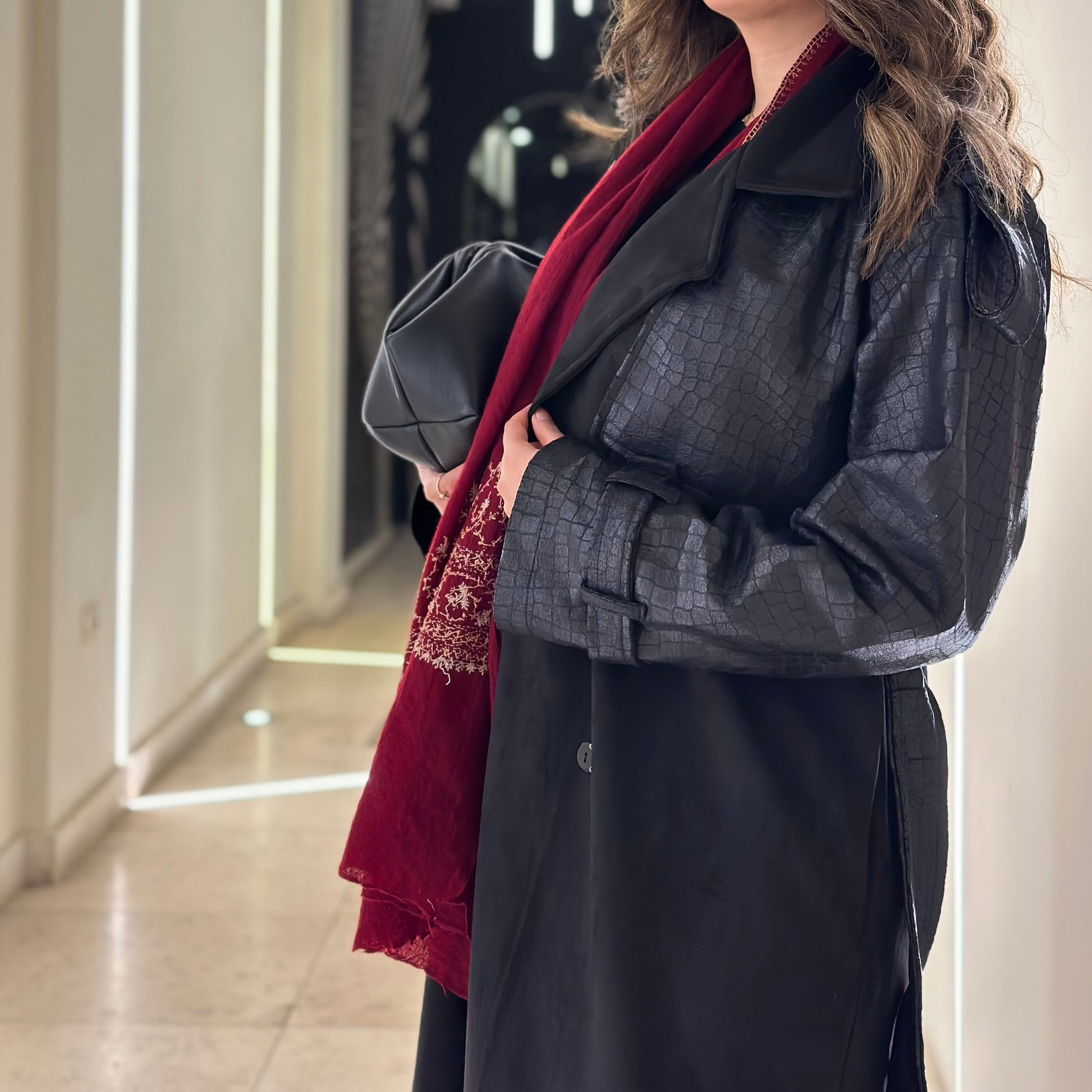 Black suede and croco leather trench coat