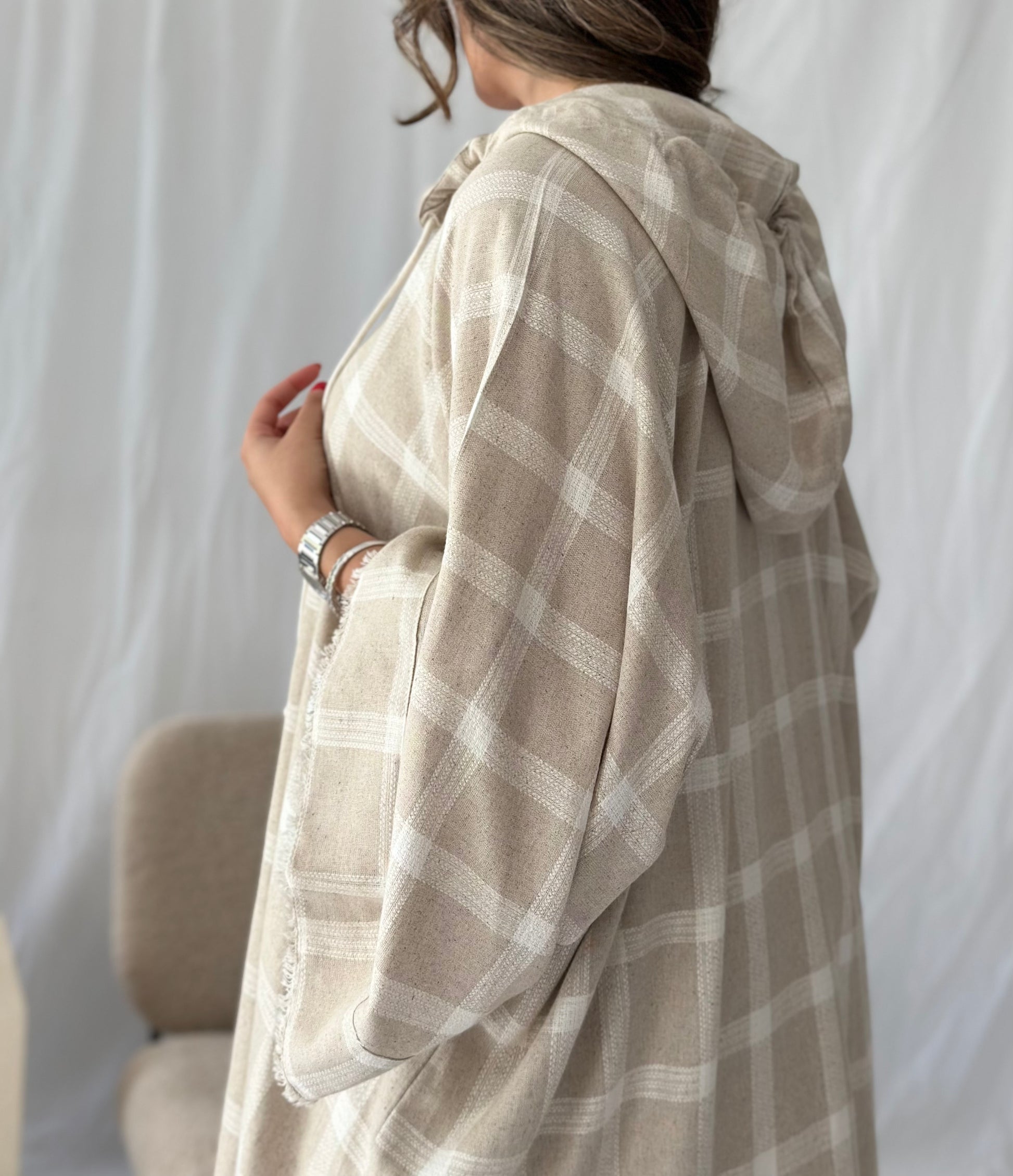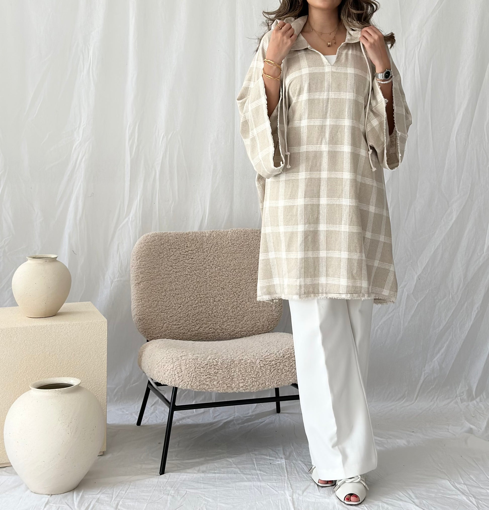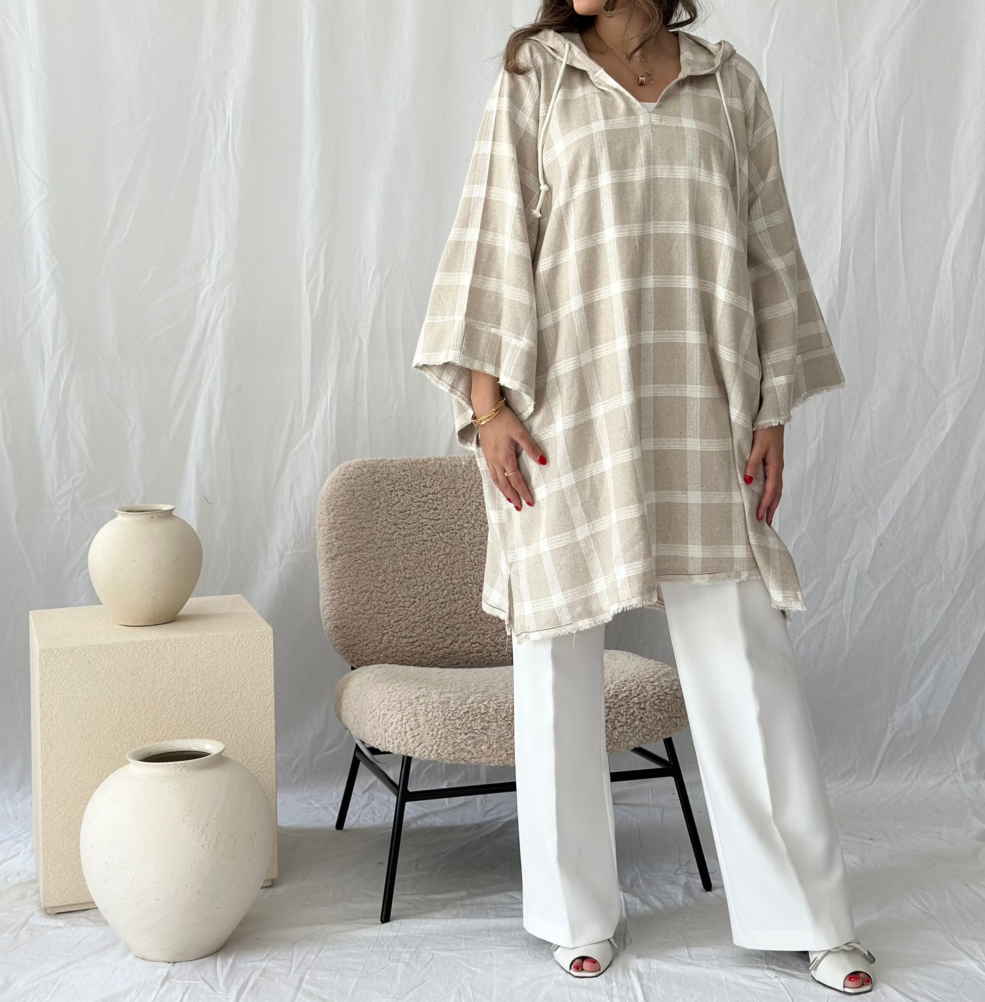 Linen chekered top in beige with a hoodie. can be worn as a casual top or beach coverup.