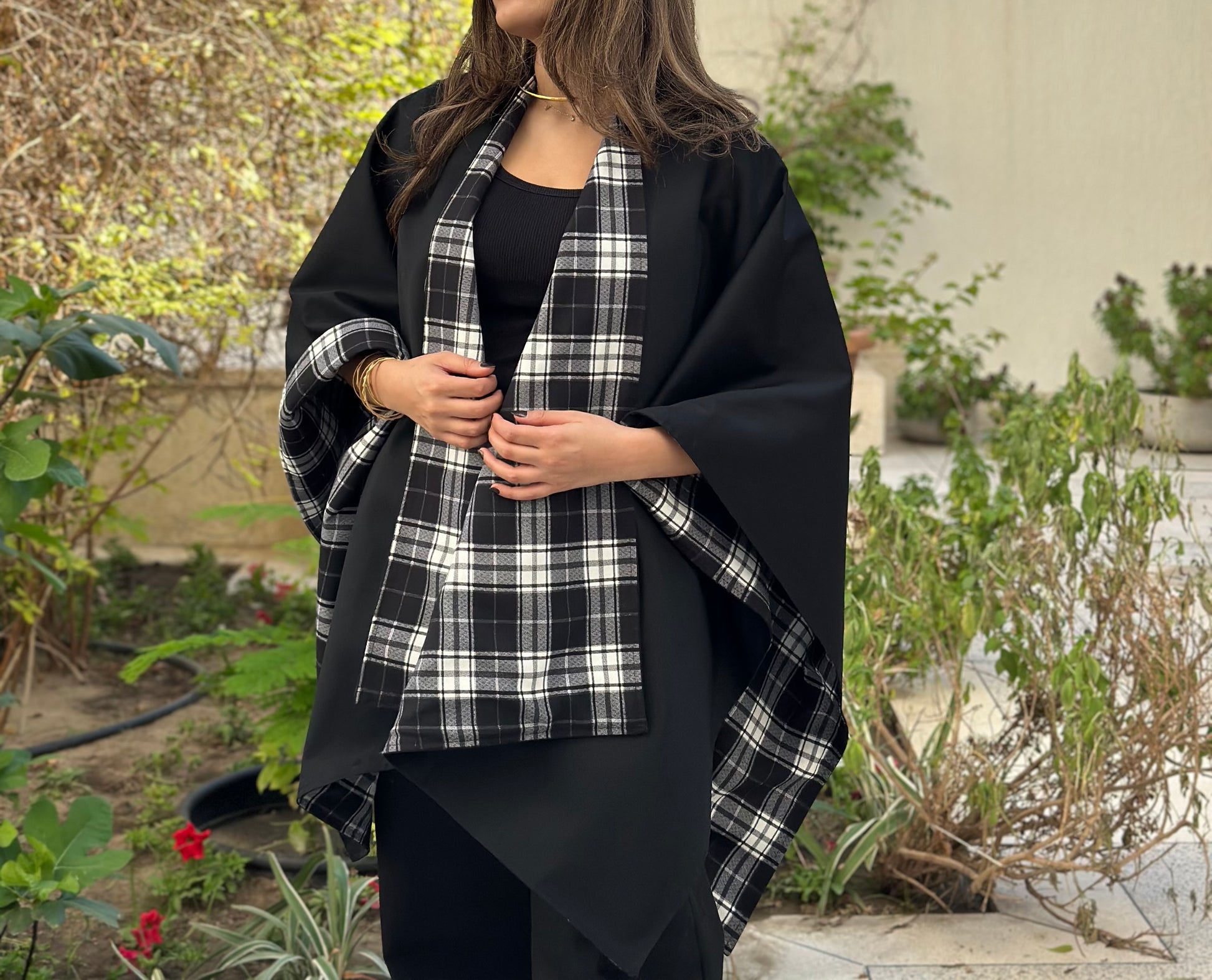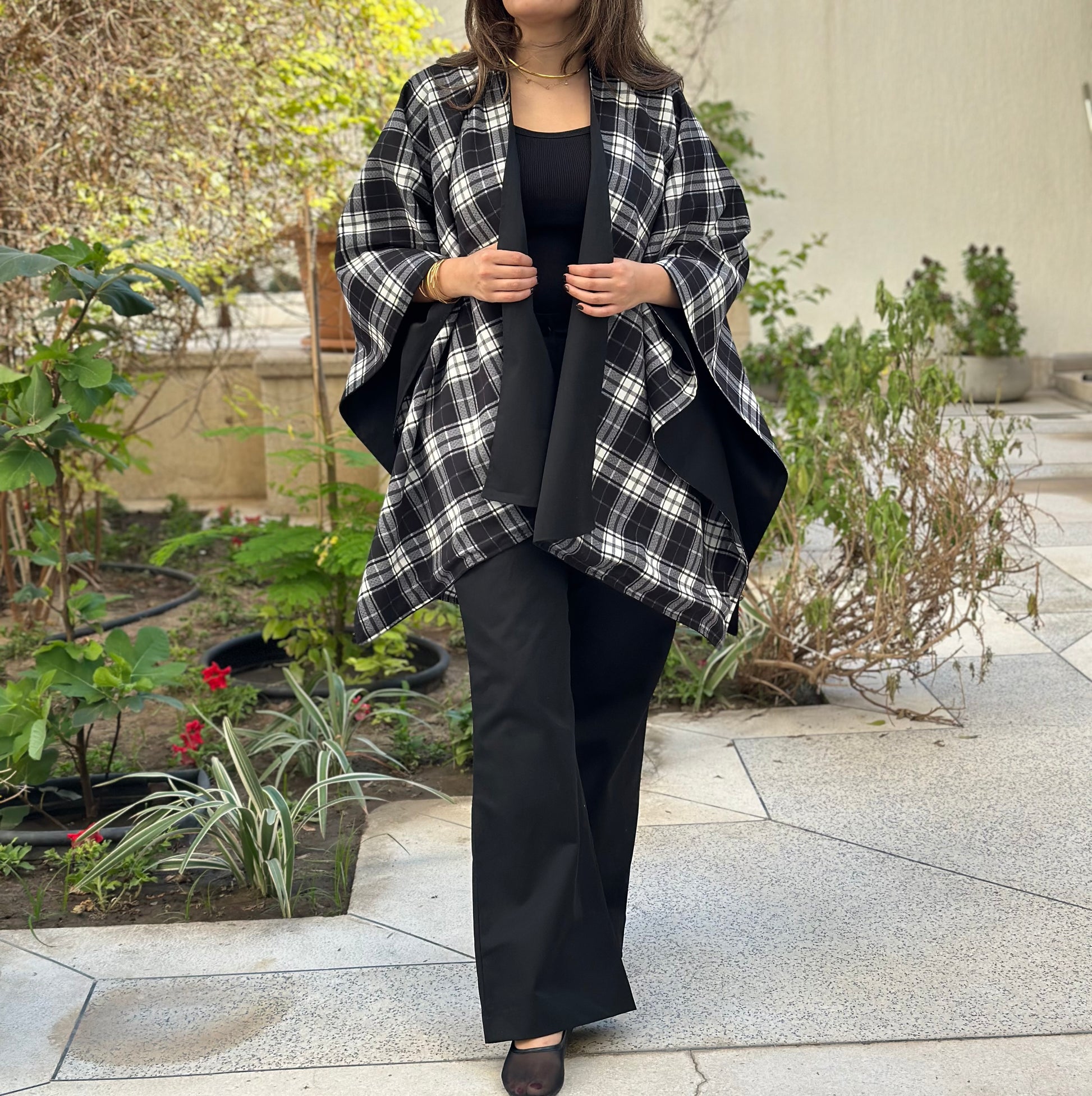 Cotton plaid & black trench fabric set of pants and cape