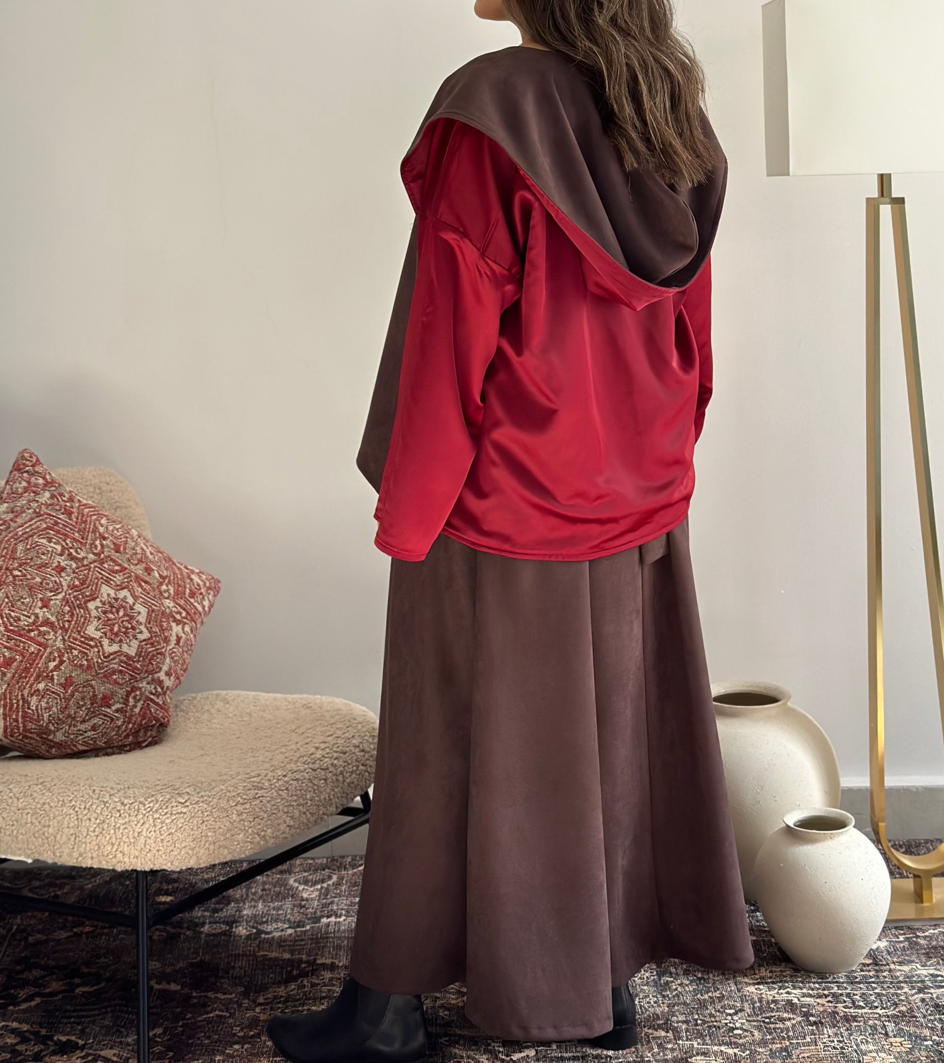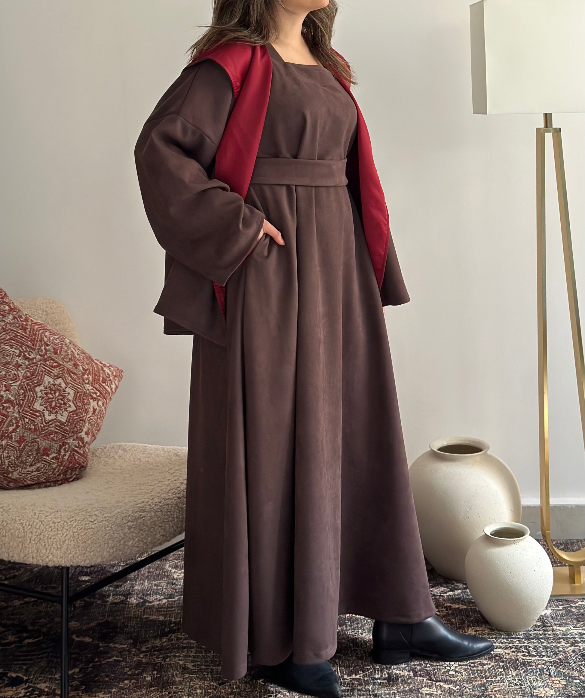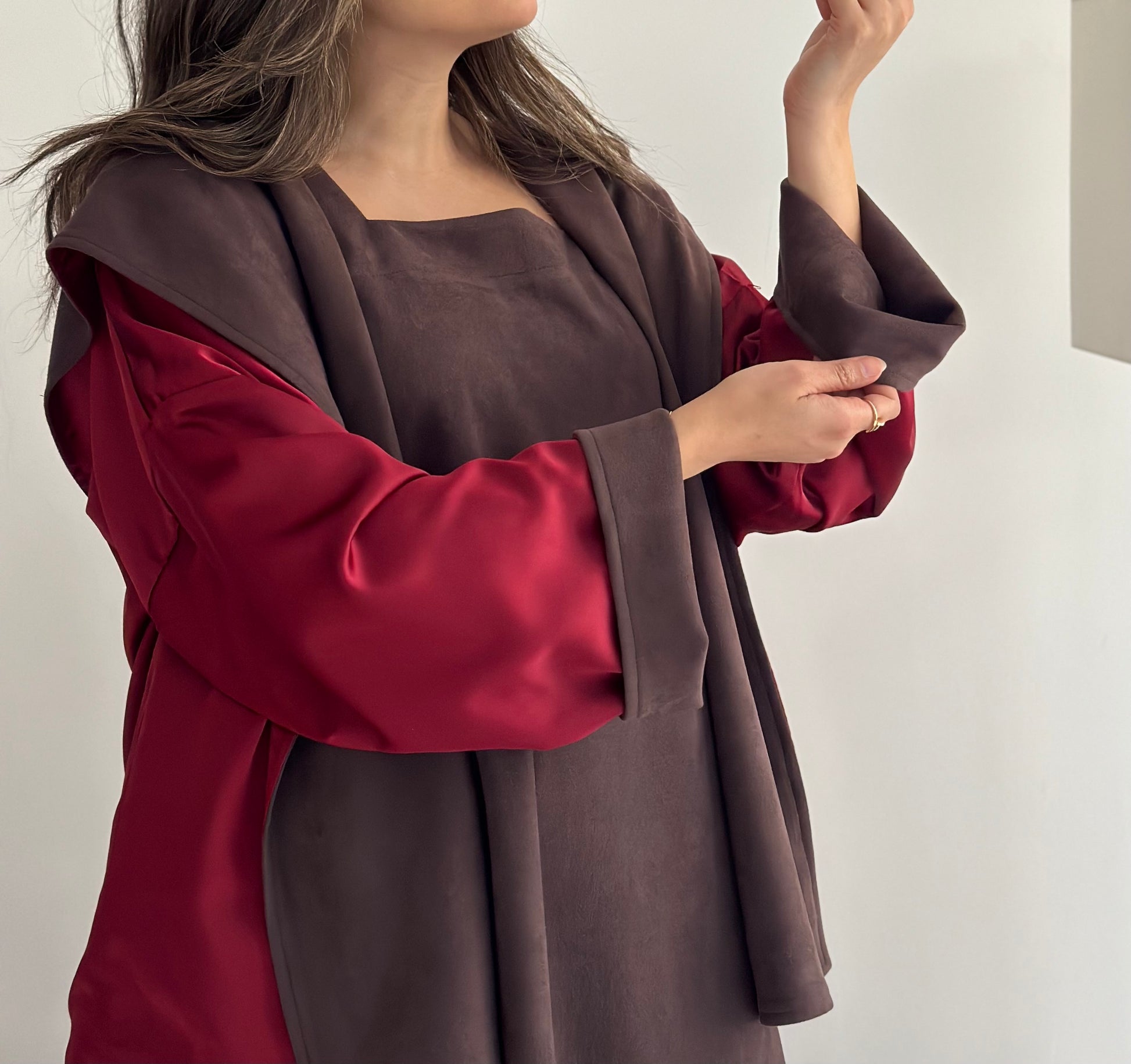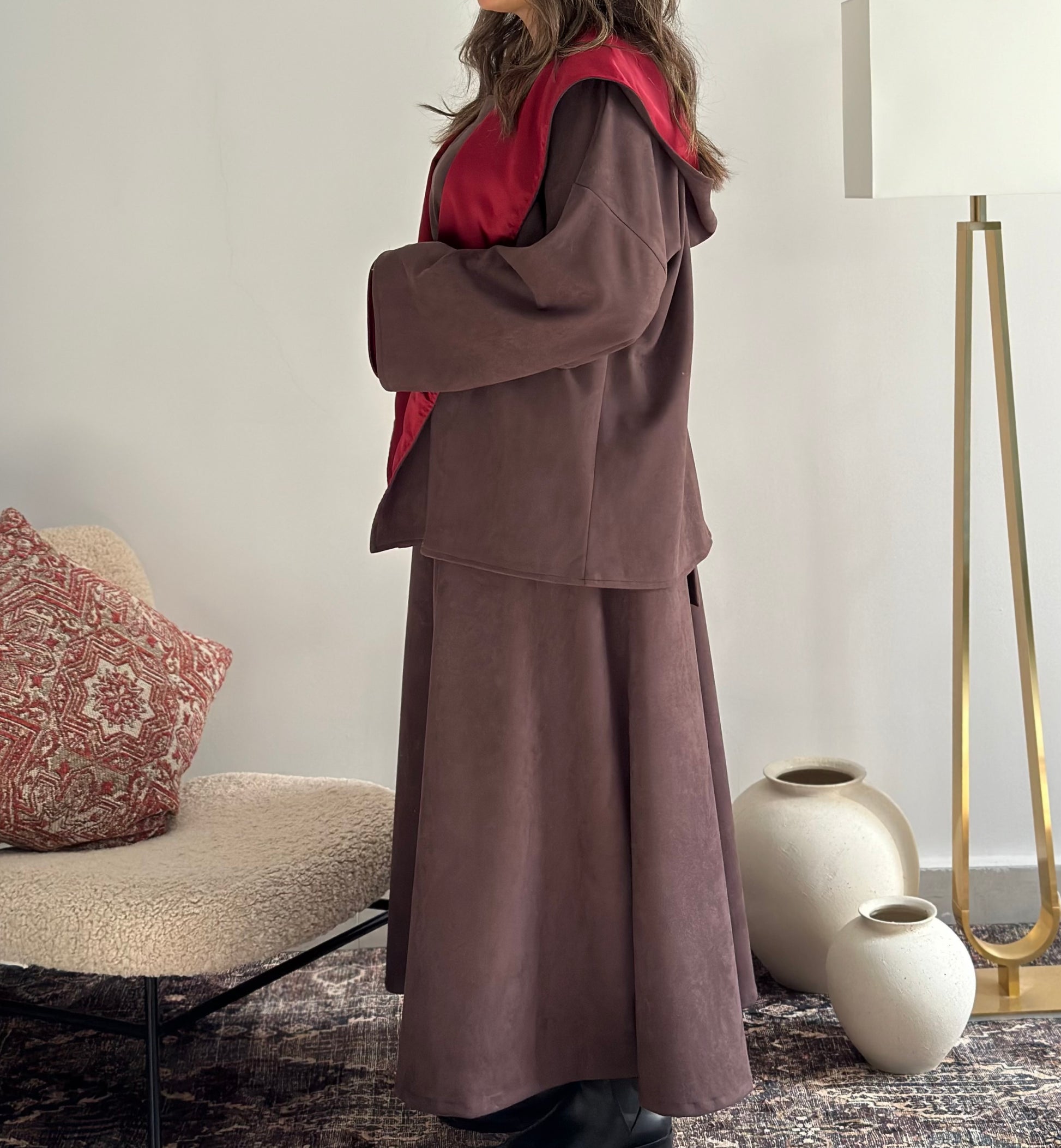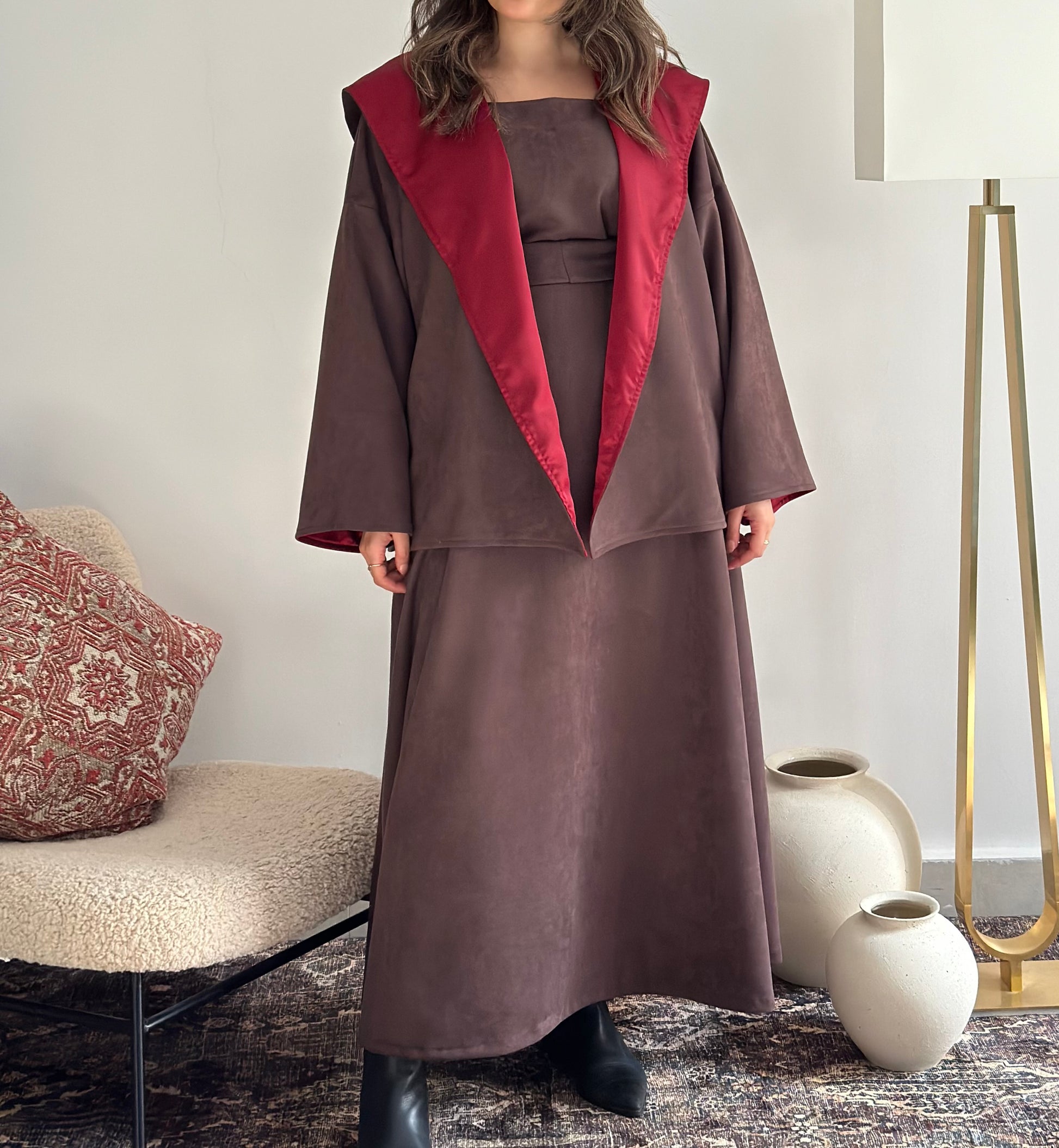 Brown suede dress with belt and double face brown suede/maroon satin jacket