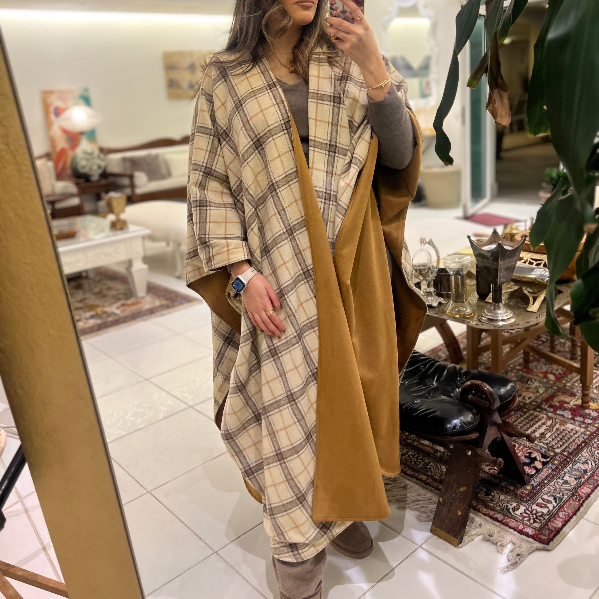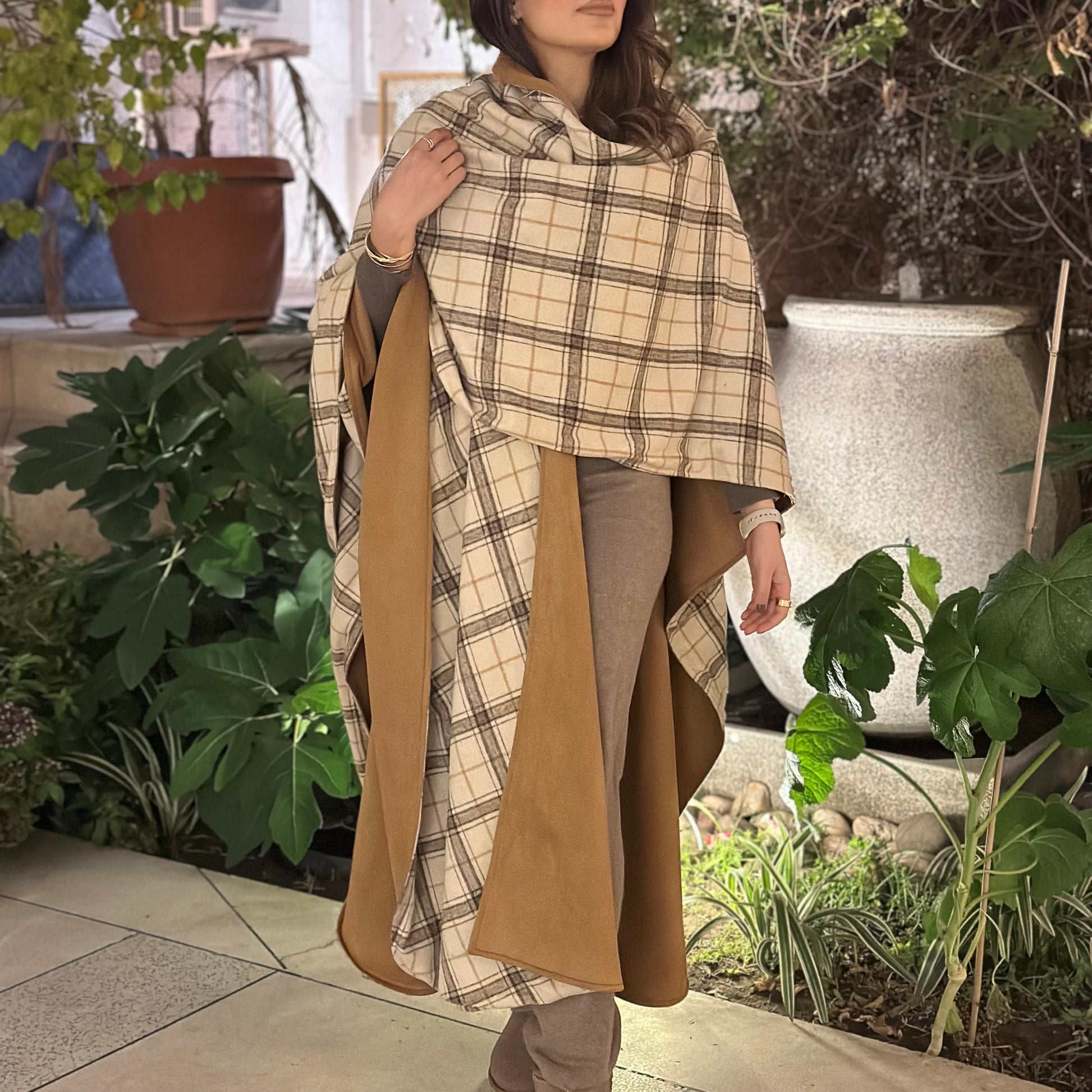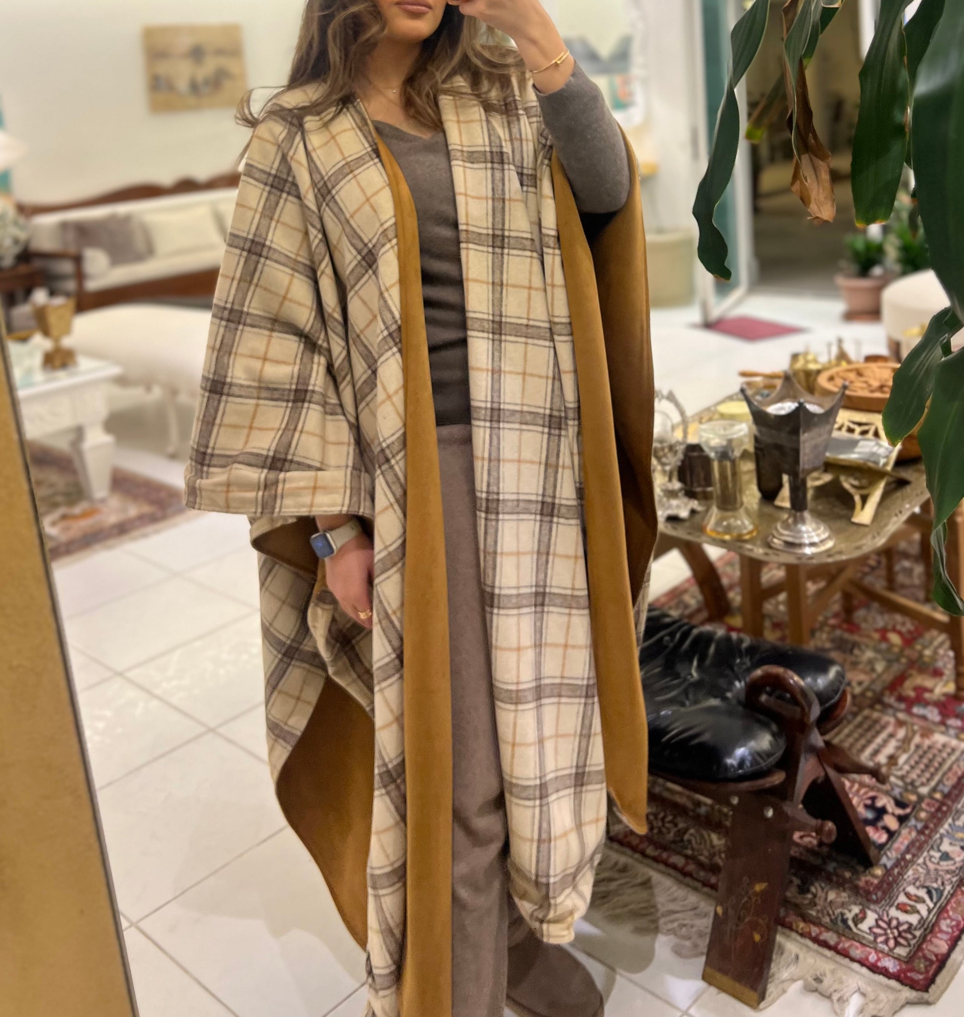 Brown suede & plaid wool double face open bisht