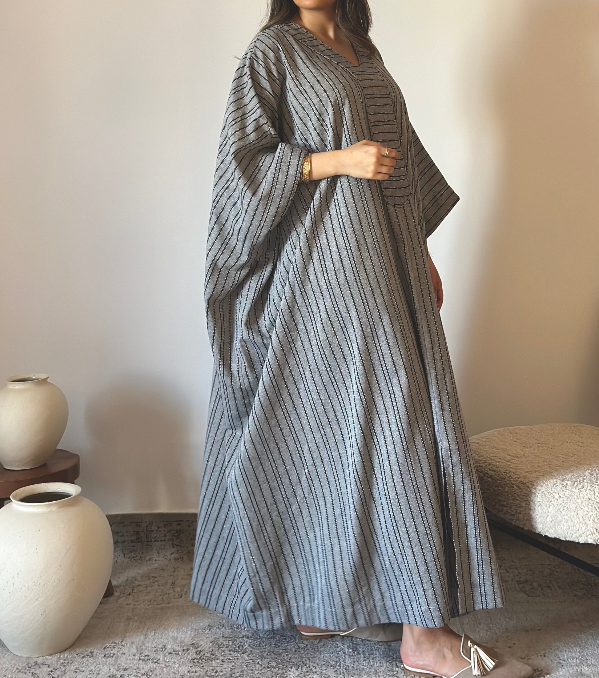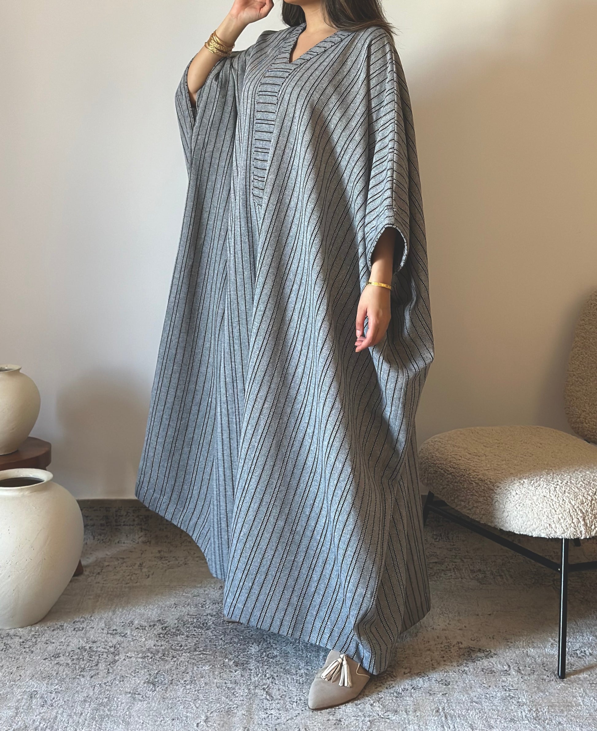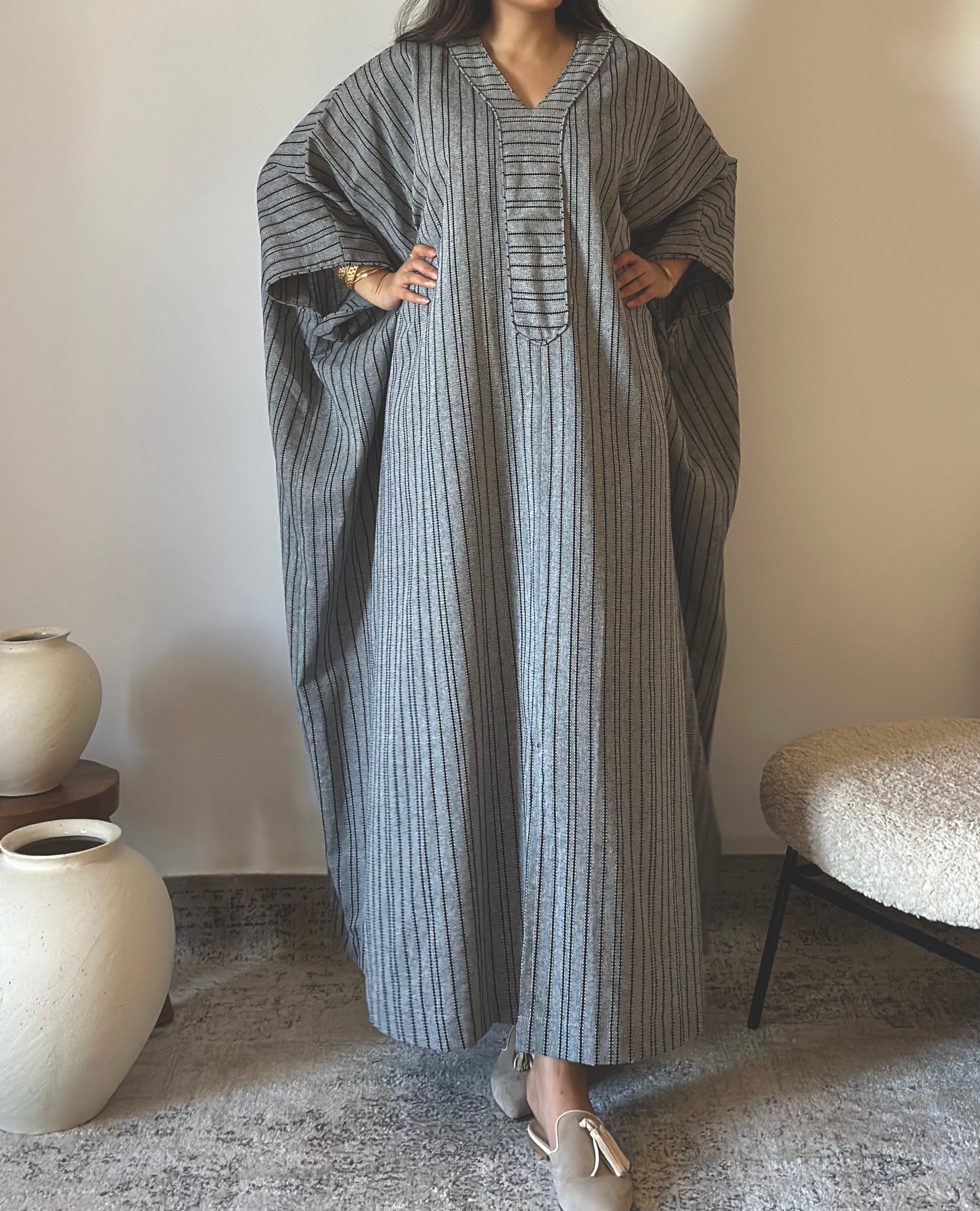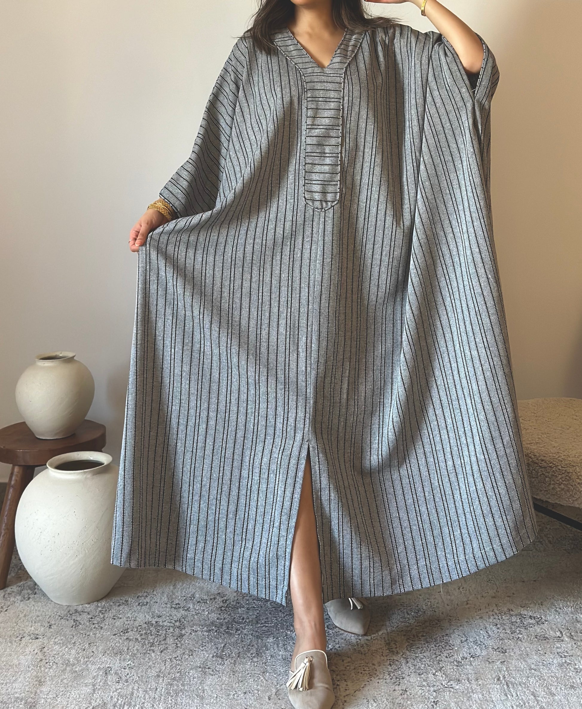 قفطان رمادي لينن بخطوط شرقية اسود/ذهبي