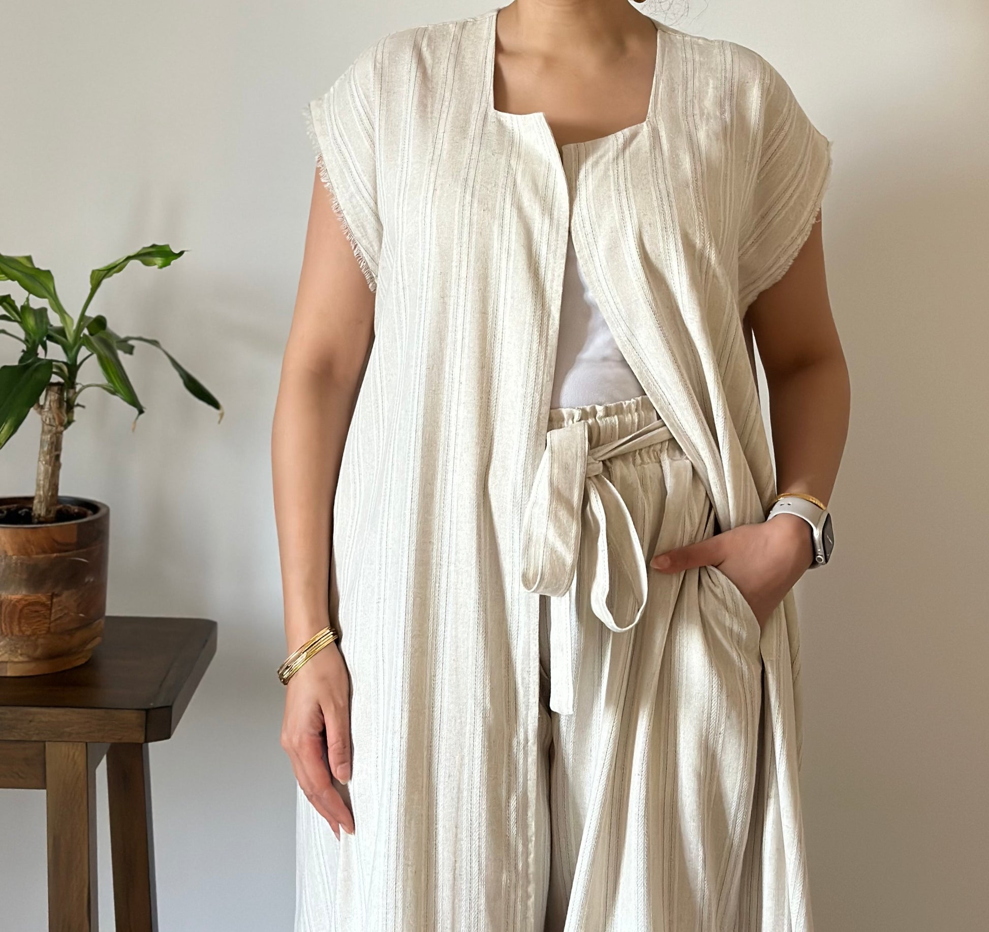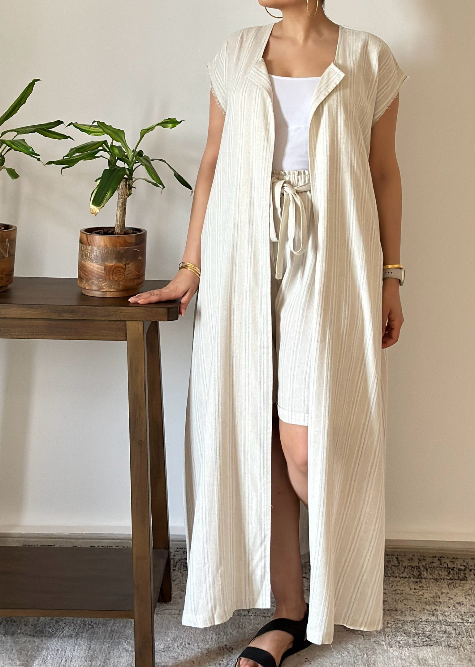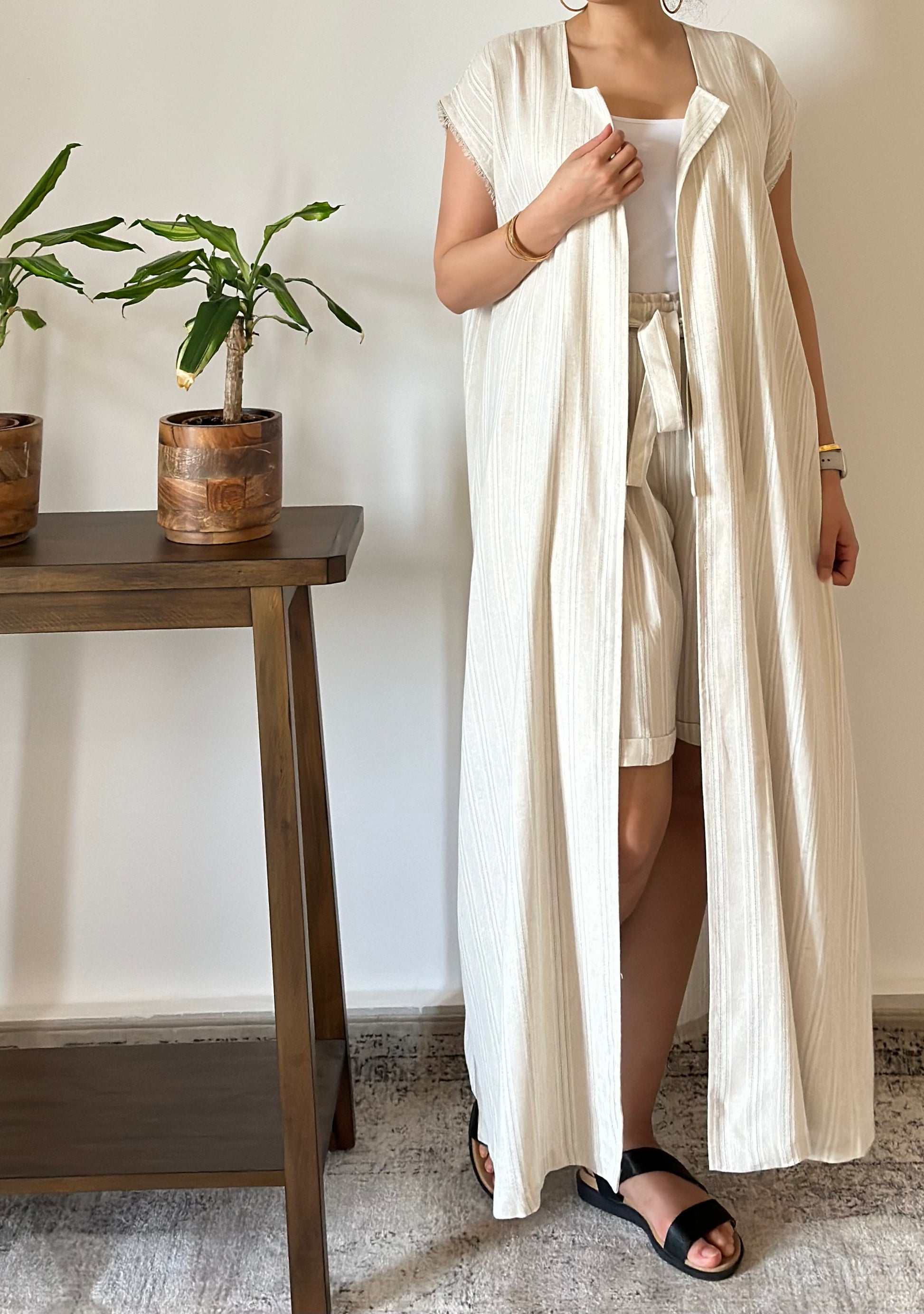 طقم شورت و فيست لينن ناعم بيج مخطط