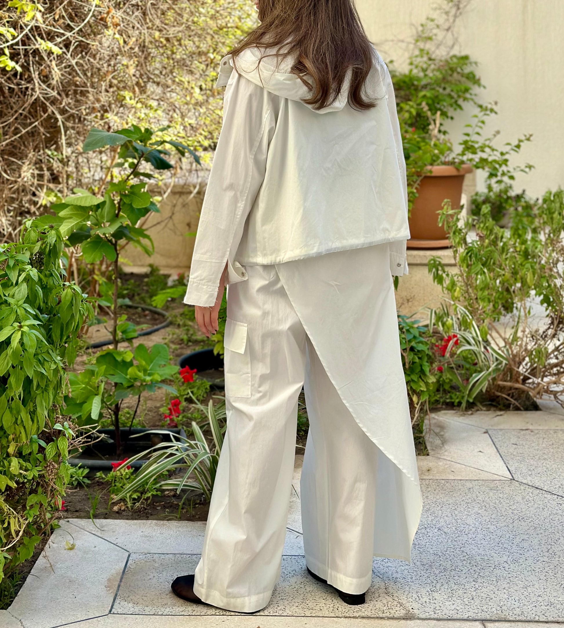 Off-white cargo cotton set of wrapped cargo-style cotton pants and cotton jacket with black details
