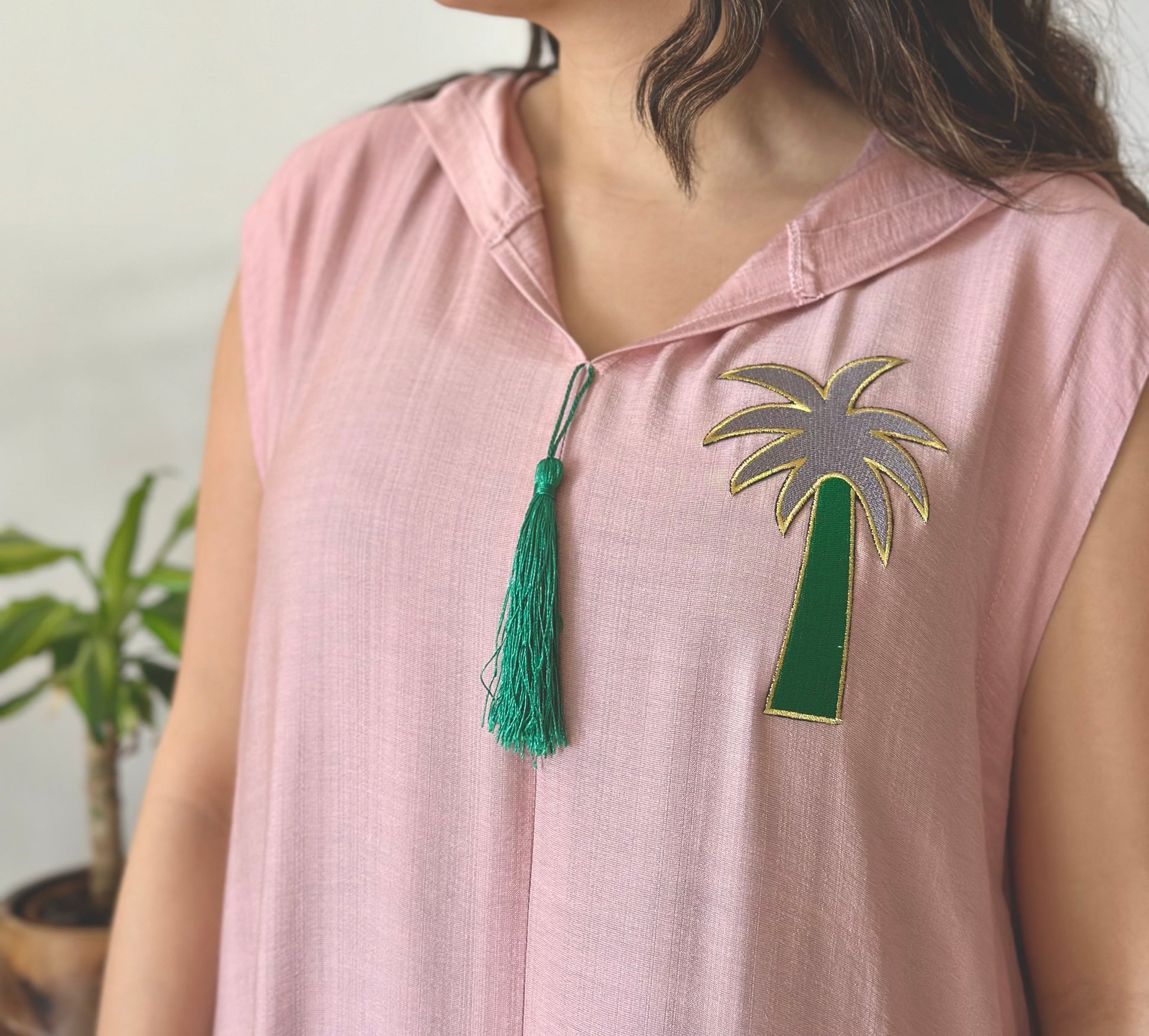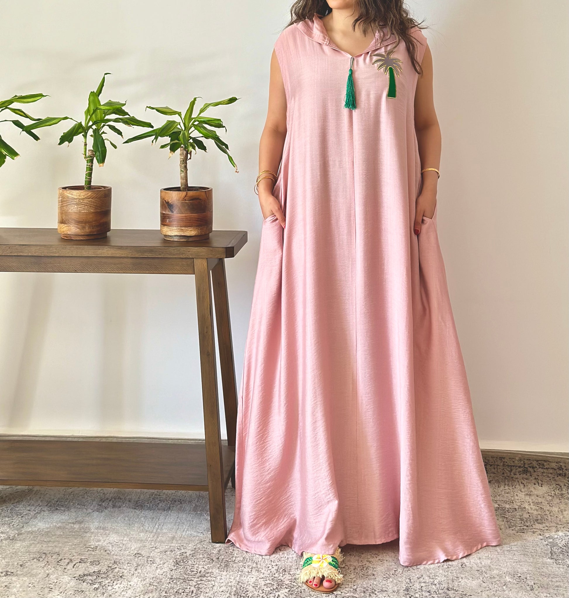 Pink mixed linen hooded dress with palm embroidery
