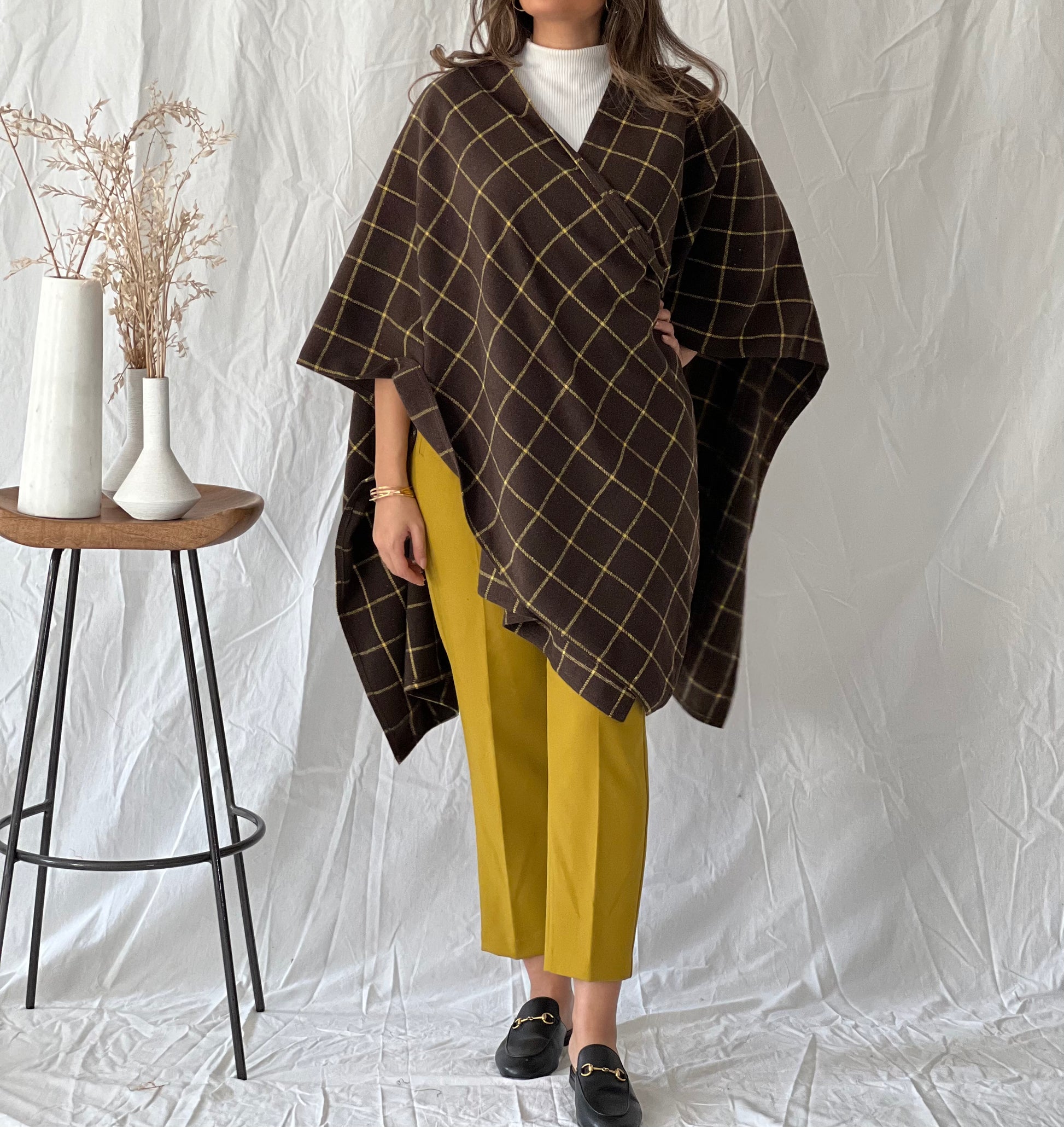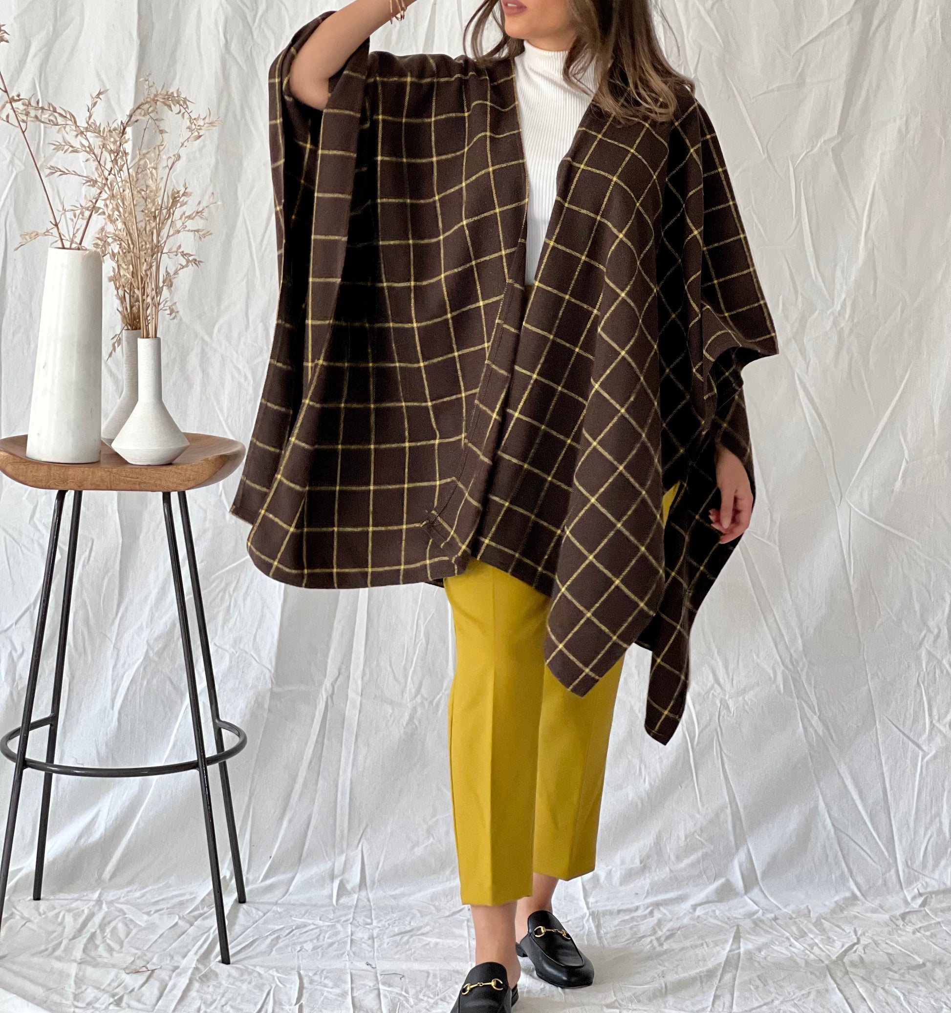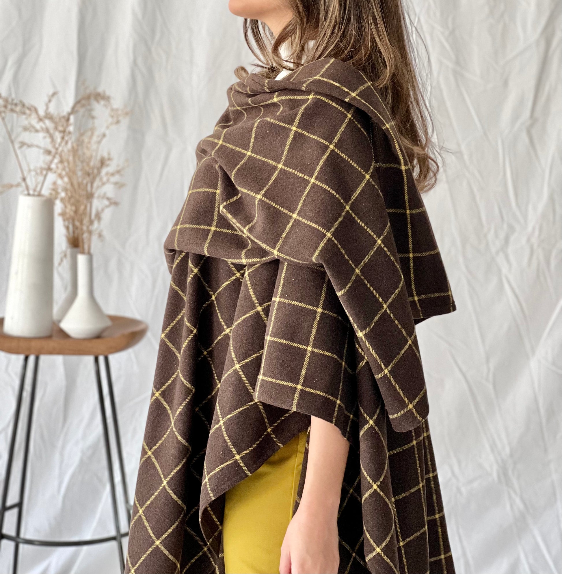 Brown checked in yellow winter poncho shawl