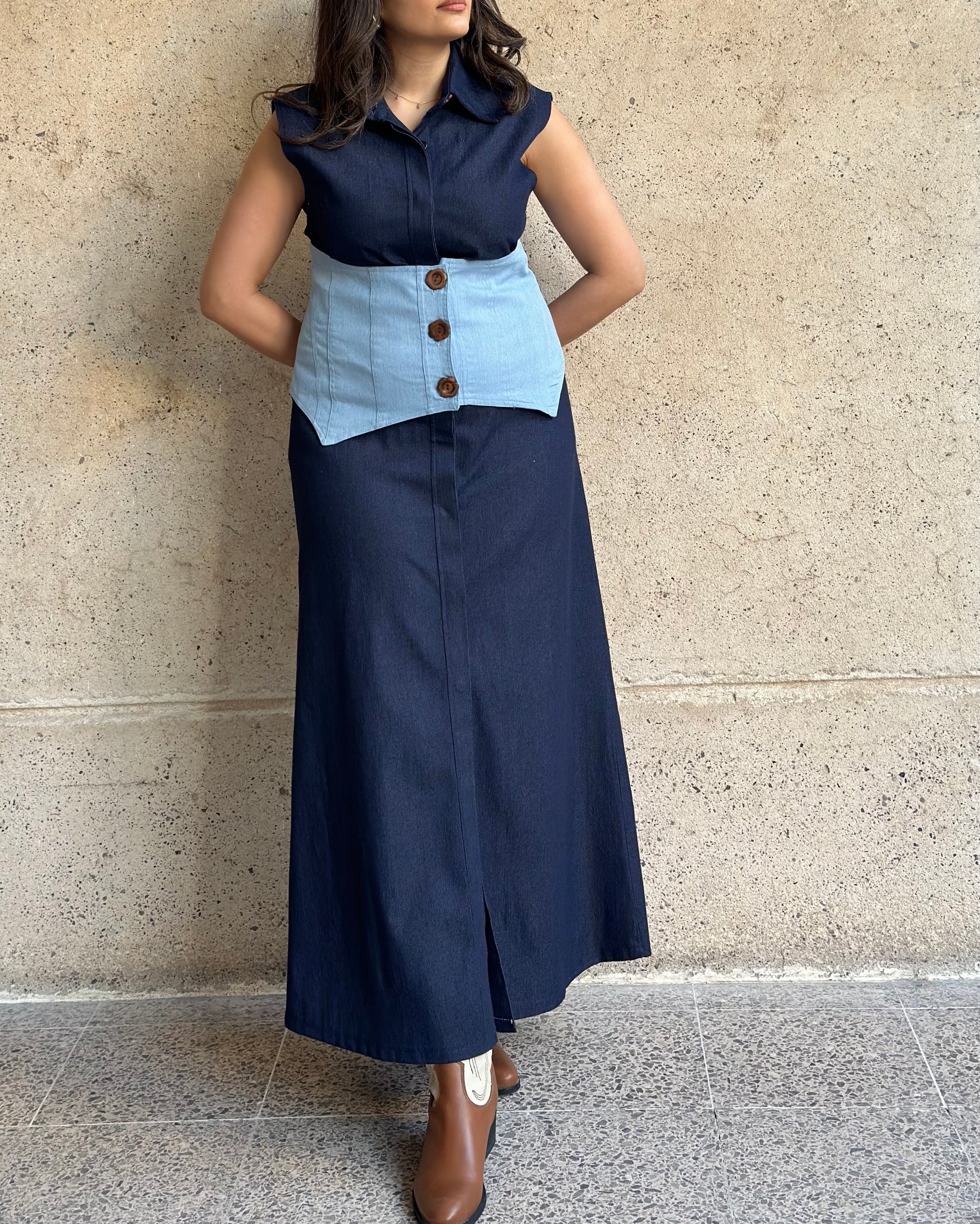 A dark straight cut dark jeans dress comes along with a light jeans corset belt with floral wood buttons
