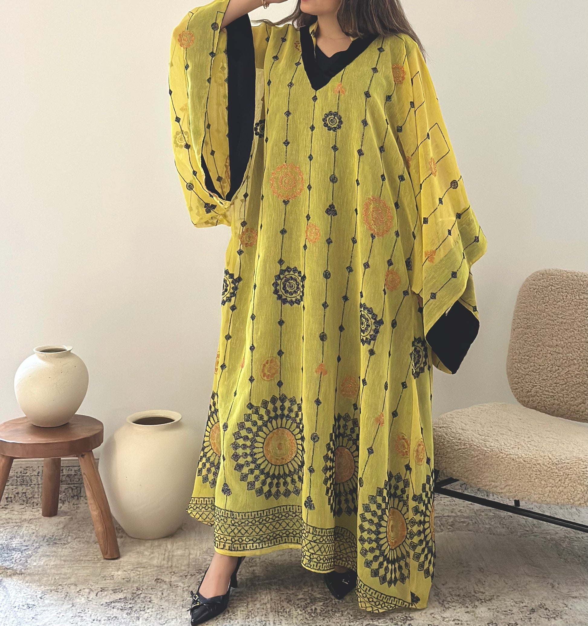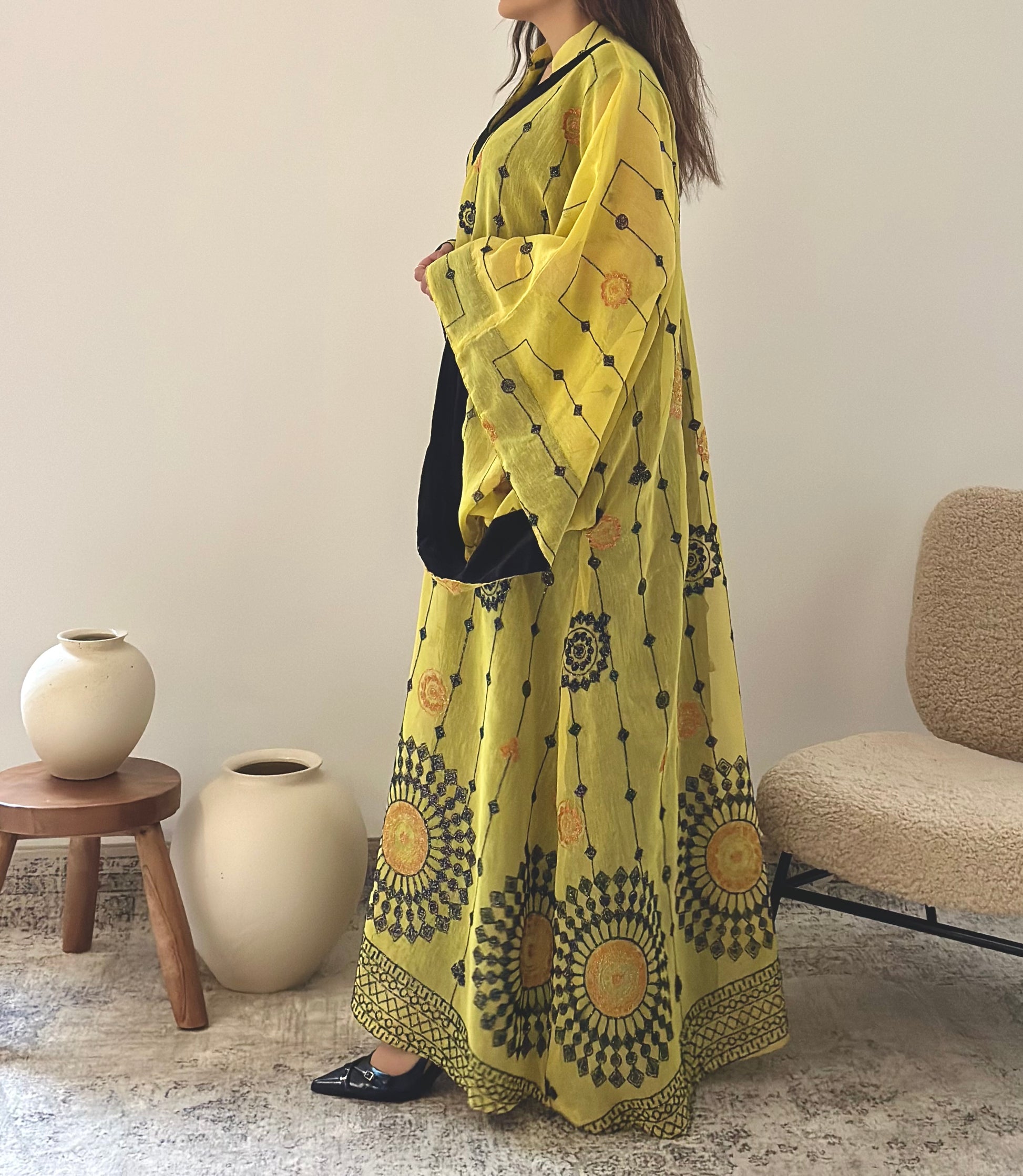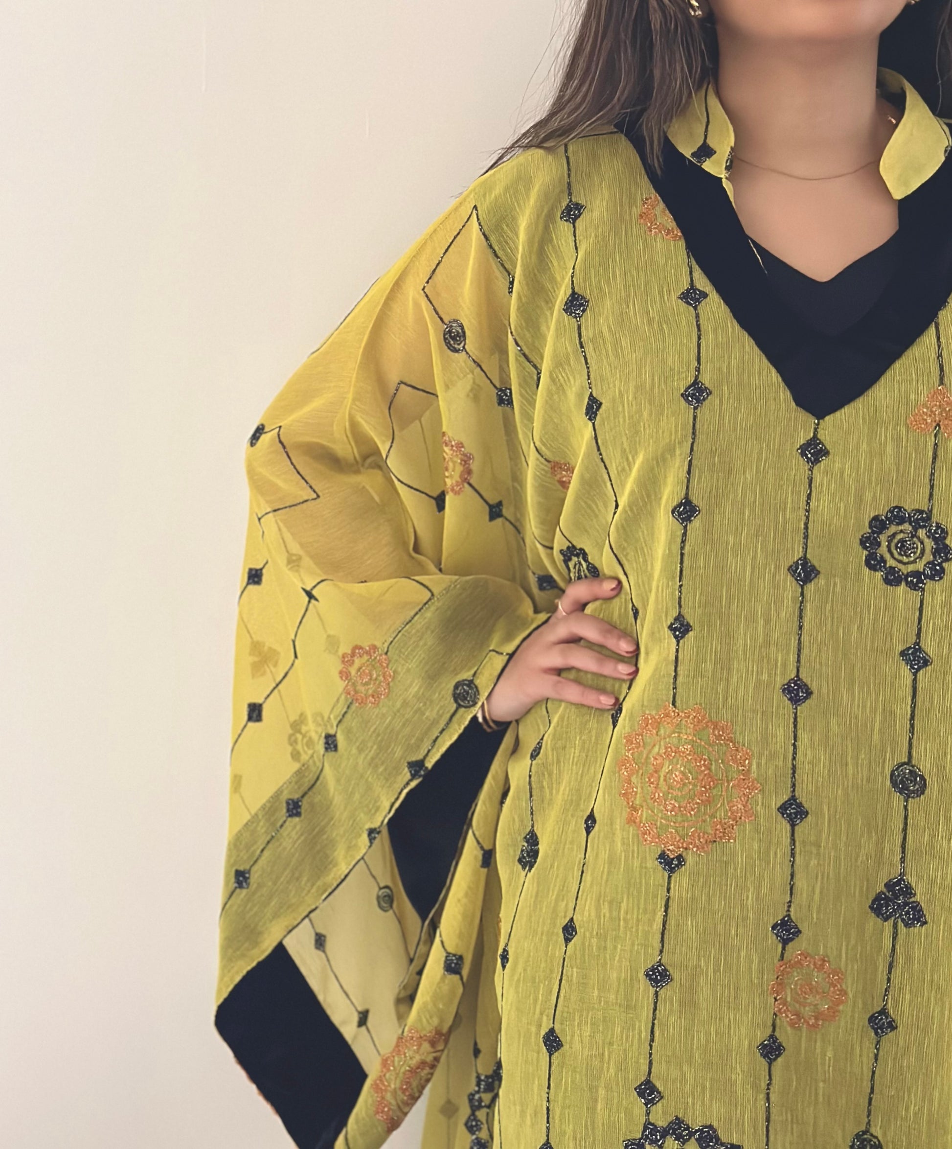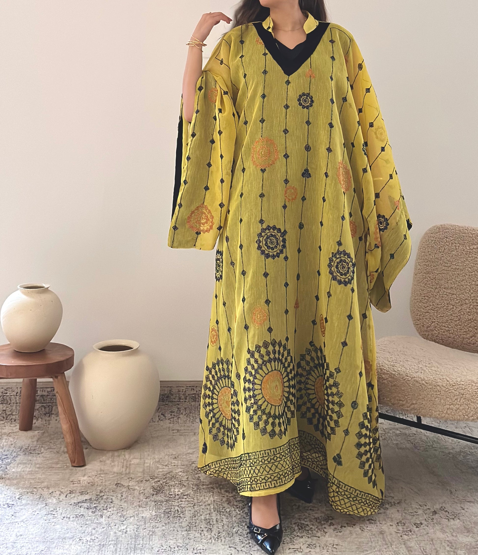 Set of black linen dress and yellow mesh thoub embroidered in black/coper with velvety details.