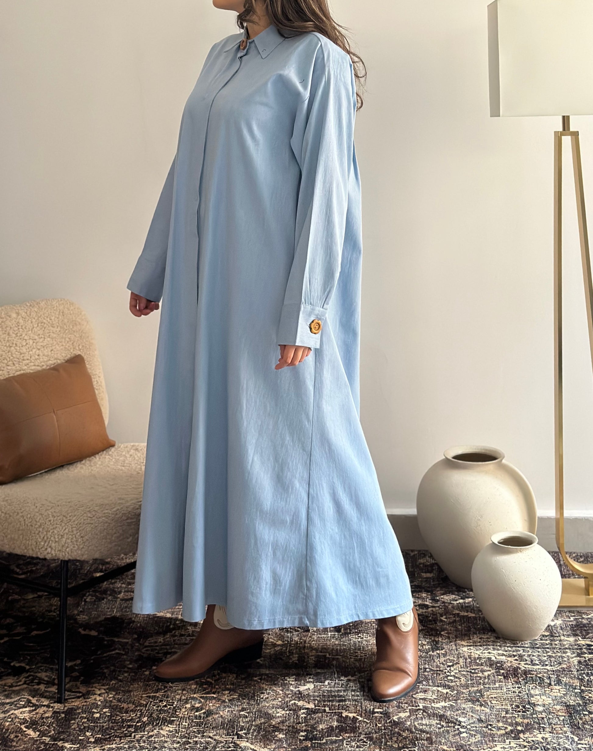 فستان جينز لون فاتح موديل القميص بمخباة و بروش الورد